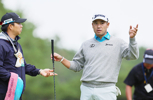 練習ラウンドをプレーする松山英樹=18日午前、宮崎市・フェニックスCC