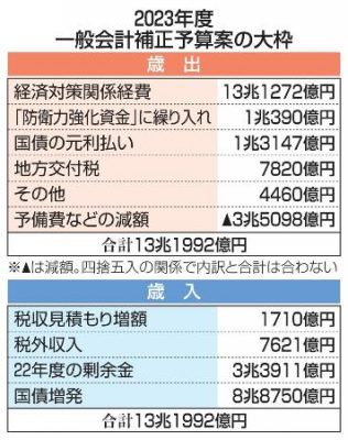2023/11/08国内外ニュース 主要政府の経済対策を裏付ける2023年度の一般会計補正予算案の大枠が8日、判明した。歳出(支出)は13兆1992億円とし、歳入(収入)の7割近くの8兆8750億円を国債の増発で手当てする。歳入に計上する税収の増加分は1710億円にとどまり、借...