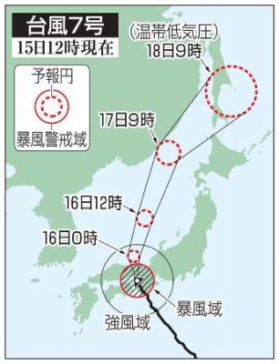 2023/08/14国内外ニュース 主要強い台風7号は14日、紀伊半島に接近した。15日に近畿から東海に上陸し、本州を縦断する見通し。近畿や東海、関東甲信、中四国で15日にかけて、局地的豪雨をもたらす線状降水帯が発生する可能性がある。気象庁は、土砂災害や河川の氾濫、暴風などに厳...
