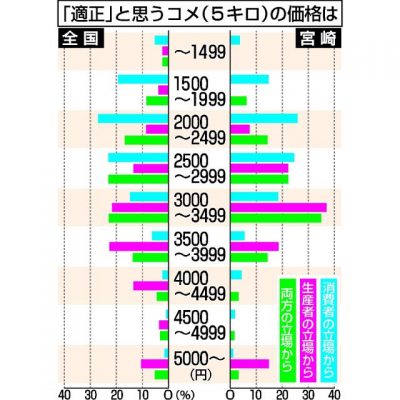 2025/06/08県内一般ニュース価格の高止まりや不足感が続くコメについて、宮崎日日新聞「SNS特報班」など読者とつながる報道に取り組む全国19紙は、合同でアンケートを実施した。店頭で5キロを購入する際に「適正」と考える価格は、消費者の立場で回答した人は2千円台が最も多か...