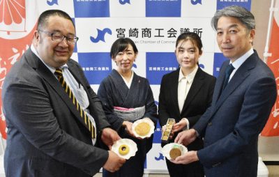 2025/10/07きょうの出来事「神武さま」の愛称で親しまれる宮崎神宮大祭にちなんだ菓子を認定する「神武さまのおすそわけ」の認定証交付式は7日、同市の宮崎商工会議所であった。県産の抹茶を使ったバターケーキやクッキーなど4商品が選ばれた。 同会議所の米良充典会頭が...