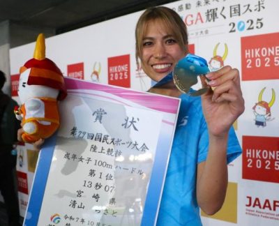 2025/10/06県内一般ニュース第79回国民スポーツ大会「わたSHIGA輝く国スポ」の陸上は5日、彦根市の平和堂HATOスタジアムで行われ、成年女子100メートル障害で清山ちさと(いちご)が優勝した。宮崎商高3年時に少年女子Aを制した2009年の新潟国体以来となる制覇。...