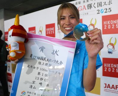 2025/10/05スポーツnow第79回国民スポーツ大会「わたSHIGA輝く国スポ」の陸上は5日、彦根市の平和堂HATOスタジアムで行われ、成年女子100メートル障害で清山ちさと(いちご)が優勝した。宮崎商高3年時に少年女子Aを制した2009年の新潟国体以来となる制覇。...