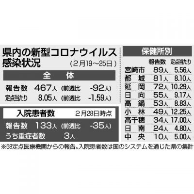 コロナ感染前週比0・8倍 3週連続で減 宮崎県内