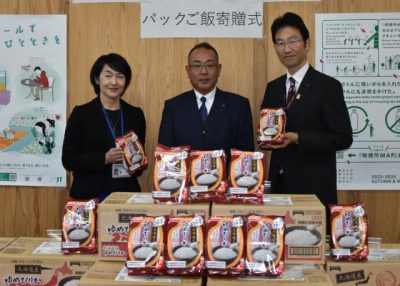 2023/12/20県内一般ニュース物価高騰に苦しむ人たちを支援しようと、日本たばこ産業(JT)宮崎支社(早矢仕(はやし)正和支社長)は19日、県と宮崎市にレンジで温めて食べる「パックご飯」計3200食を寄贈した。 パックご飯はJTグループ会社の製造品で、同支社が寄...
