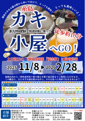 2025/10/22サンプル九州旅客鉄道株式会社 カキのシーズンにあわせて、土日祝日の一部の快速列車が福吉駅に臨時停車いたします。福吉駅から福吉漁港のカキ小屋までは、徒歩約10分の距離!福岡市地下鉄の博多駅・天神駅などから乗り換えせずにJR筑肥線の福吉駅までご乗車でき...