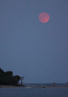 2023/09/29トピックnews「中秋の名月」の29日、宮崎市では雲の切れ間から真ん丸の月が夜空を照らし、多くの人を魅了した。 同市の青島海水浴場では午後6時15分ごろ、東の空に薄く赤みがかった月が見え始めた。月が海上を照らす「月の道」も浮かび上がり、通行人は立...