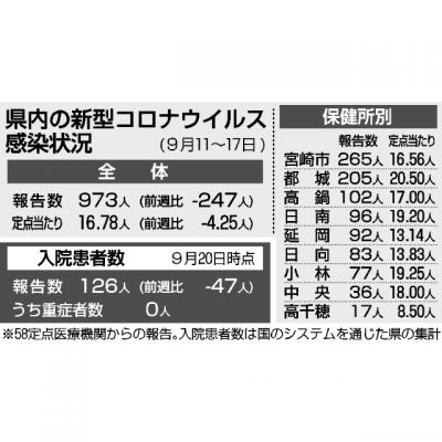 2023/09/22県内一般ニュース県は21日、県内の新型コロナウイルスの定点当たり報告数(11~17日)が前週比0・8倍の16・78人だったと発表した。3週ぶりに前週を下回った。 感染症対策課によると、58定点医療機関からの報告数(同)は973人。1日当たりの推計...