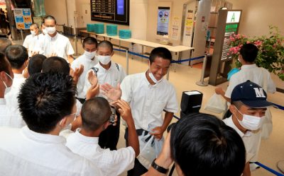 一戦必勝で全力プレー 宮崎学園、空港で出発式