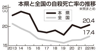 2023/07/05県内一般ニュース2022年の本県の自殺死亡率(人口10万人当たりの自殺者数)が前年比0・8人増の20・4人で、全国ワースト3位だったことが4日、厚生労働省の人口動態統計(概数)を基にする県のまとめで分かった。前年はワースト5位で、全国平均を上回る厳しい水...