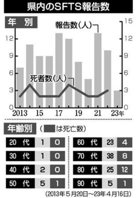 2023/05/03県内一般ニュースマダニが媒介するウイルス感染症「重症熱性血小板減少症候群(SFTS)」の宮崎県の発生報告者数が、統計を取り始めた2013年以降、全国の自治体で初めて100人になった。感染者100人のうち、年齢別では70代が最多の38人、市町村別では宮崎市...