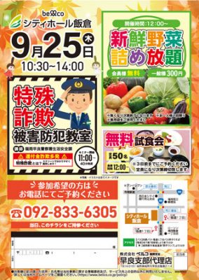 2025/09/08サンプル株式会社ベルコ新鮮野菜詰め放題や無料試食会も 株式会社ベルコ(本社:大阪府池田市)は、地域の皆さまに向けた防犯啓発と交流の場として、2025年9月25日(木)に「シティホール飯倉」(福岡市早良区)にて「特殊詐欺被害防犯教室」を開催いたし...