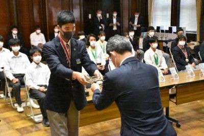 2022/10/25県内一般ニューススポーツや文化などの分野で活躍した中高生をたたえる本年度の第1回県学生栄誉賞授与式は24日、県庁であった。全国的な大会やコンクールなどで優秀な成績を収めた10団体6個人を表彰した。 受賞した38人のうち、36人が出席。河野知事が代...