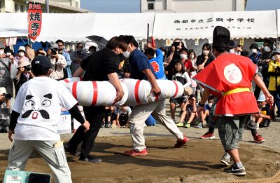 2022/10/25トピックnews第15回西都三財へそ祭り(三財地域づくり協議会主催)は23日、西都市の三財小中グラウンドであった。新型コロナウイルス感染拡大の影響で3年ぶりの開催。地域住民らが「へそ踊り」「へそ相撲」などの名物イベントを楽しんだ。 三財地域が地理...