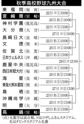 2022/10/15学生スポーツ22日に沖縄県で開幕する高校野球の秋季九州大会(第151回九州大会)の組み合わせ抽選会は14日に那覇市であり、全16校の1回戦のカードが決まった。県予選優勝の宮崎商は22日の第1試合(午前10時・コザしんきんスタジアム)で東福岡と対戦。準...