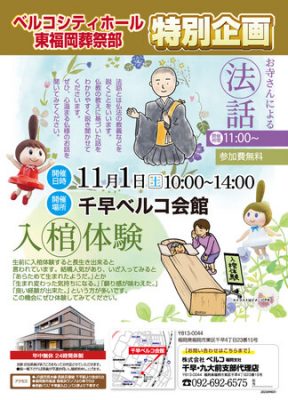 2025/10/21サンプル株式会社ベルコ~千早ベルコ会館にて特別企画を開催~ 株式会社ベルコ(本社:大阪府池田市、代表取締役社長:齋藤 斎)は、地域の皆さまに仏教文化への理解と“いのち”について考える機会を提供するため、**ベルコシティホール東福岡葬祭部(千早ベル...