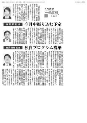 2022/06/22紙面から/最終日/特別給付金/今月中振り込む予定/教員研修制度/独自プログラム構築 山内佳菜子議員(県民連合宮崎、宮崎市区)は、物価高騰などに直面する低所得の子育て世帯を支援する特別給付金について尋ねた。 重黒木清福祉保健部長は、県が給...