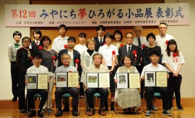 2022/06/14県内一般ニュース宮崎市のみやざきアートセンターで開催していた「第12回みやにち夢ひろがる小品展」(宮崎日日新聞社主催)は12日、表彰式を行い、閉幕した。 表彰式は同市の宮日会館であり、出席した入賞者45人に賞状と副賞を贈った。宮崎日日新聞社の田代...