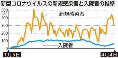 2022/04/05県内一般ニュース宮崎県内の新型コロナウイルス新規感染者数(4日時点)が前週の同じ曜日を9日連続で上回るなど、増加傾向が加速している。県は5日以降、新規感染者が500人を超え、過去最多の水準に達すると見込む。重症、中等症などで入院する人の数は高止まりが続い...