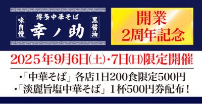【元祖泡系博多一幸舎】プロデュース、「博多中華そば幸ノ助(こうのすけ)」が開業2周年!2025年9月6日(土)・7日(日)の2日間は「中華そば」を感謝価格1杯500円でご提供いたします!