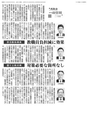 2022/03/02紙面から/2日目/部活動指導員/教職員負担減に効果/盛り土総点検/対策必要な箇所なし 図師博規議員(無所属の会チームひむか、児湯郡区)は、都農町がふるさと納税の対象自治体指定を取り消された問題を受け、「町内事業者を県の返礼品取扱事業者として...