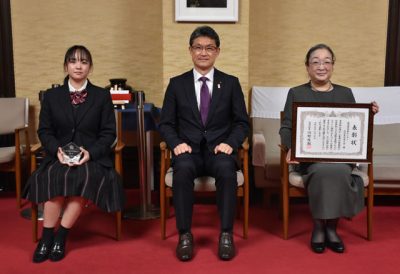 2021/12/21県内一般ニュース県の「人にやさしい福祉のまちづくり」功労団体表彰式と、「心の輪を広げる体験作文」入賞者表彰伝達は20日、県庁であった。功労団体は視覚障害者センター点訳音訳友の会(宮崎市、川瀬史子会長)、作文は内閣府の高校生区分佳作に選ばれた妻高2年・川崎...