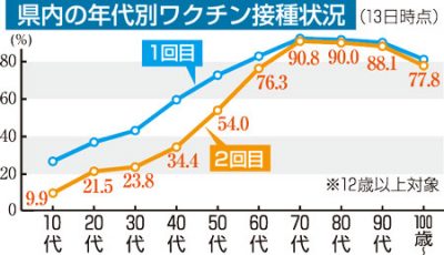 2021/09/16社会news県は16日、新型コロナウイルスワクチンの接種状況について、県内の年代別の接種率を初めて明らかにした。13日時点で2回接種を終えた人は70~80代では90%台に達している一方、接種が本格化したばかりの20、30代は20%台にとどまっている。...