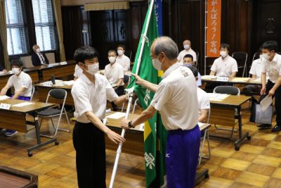 2021/07/01一般スポーツ第76回国体「三重とこわか国体」(三重県で9月25日開幕)への出場権を懸けた、第41回九州ブロック夏季大会の県選手団に対する団旗授与式は30日、県庁であった。 式では、団旗が県スポーツ協会会長の春山豪志団長、同協会専務理事の佐多裕...