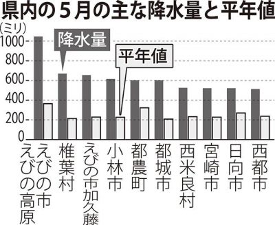 2021/06/19県内一般ニュース県内で雨量を観測する26地点のうち8地点で、5月の月間降水量が過去最多を更新したことが宮崎地方気象台のまとめで分かった。トップのえびの市えびの高原は1046・5ミリで過去最多の約1・3倍に達したほか、平年と比べて3倍余りの雨量を観測した地...