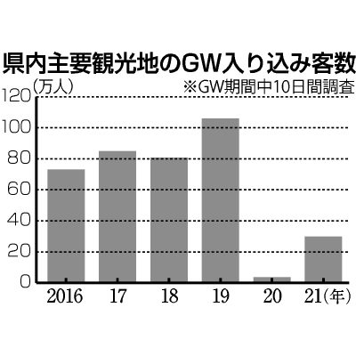 2021/05/19県内一般ニュースゴールデンウイーク(GW)の10日間(4月26日~5月5日)に県内の主要観光地38カ所を訪れた入り込み客数が、前年同期比で8・1倍の29万9490人に上ったことが18日、県のまとめで分かった。県は、前年は新型コロナウイルス禍で政府の緊急事...