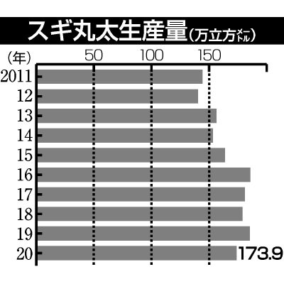 スギ丸太20年生産量、本県30年連続日本一 減少幅は過去最大