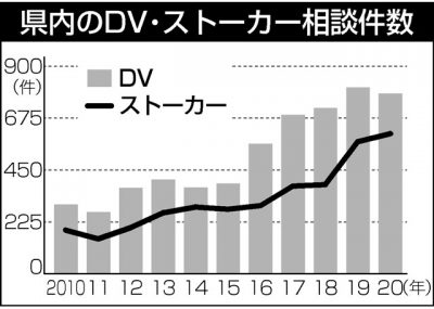 2021/04/16県内一般ニュース県警に寄せられた2020年のストーカー相談件数が過去最多の607件(前年比34件増)に上ったことが15日、県警のまとめで分かった。ドメスティックバイオレンス(DV)の相談件数も781件(同27件減)に高止まり。県警は「犯行がエスカレートし...