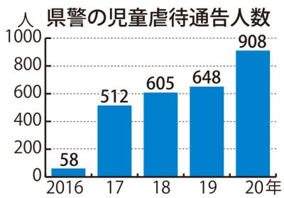 2021/03/15社会news県警が児童虐待の疑いがあるとして、2020年に県内3児童相談所に通告した子どもの数が前年比260人増の908人で、過去最多を更新したことが15日、分かった。県警は全国で重大事件が相次ぎ「県民の関心が高まり、通報が増えた」とみるが、現場の児...