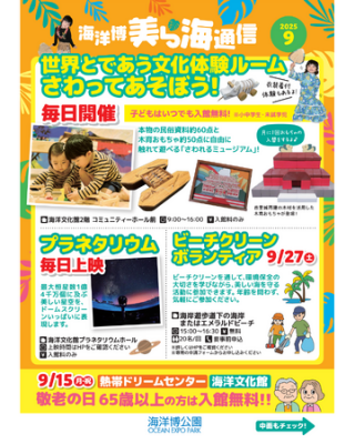 2025/08/25サンプル一般財団法人 沖縄美ら島財団 海洋博公園では、園内の最新情報やイベント情報をお届けする広報誌『美ら海通信』2025年9月号を発行いたしました。本号では、海洋博公園で楽しめる様々なプログラムを紹介しております。 イベント情報 9月15日...