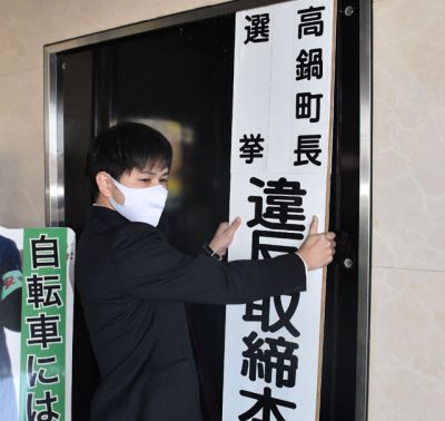 2021/01/14きょうの出来事任期満了に伴う高鍋町長選(2月9日告示、同14日投開票)を前に高鍋署は14日、選挙違反取締本部を設置した。上平賢一署長を本部長に約80人の全署員体制で戸別訪問など公選法違反を取り締まる。 同日午前、署員が正面玄関そばに取締本部の看...