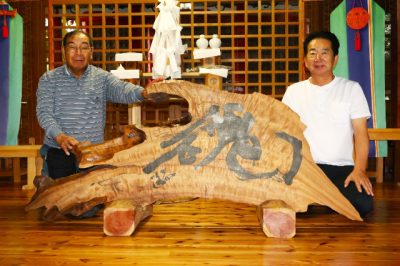 国富・衾田八幡宮に銘木の書奉納 書作家・森さん揮毫