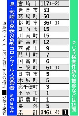 2020/08/25県内一般ニュース県と宮崎市は24日、県内で新たに4人の新型コロナウイルス感染を確認したと発表した。23日のPCR検査で判明。いずれも重症化はしていない。県内の感染者は計346人となった。 新規感染者4人のうち、都城市の40代女性と三股町の90代女...