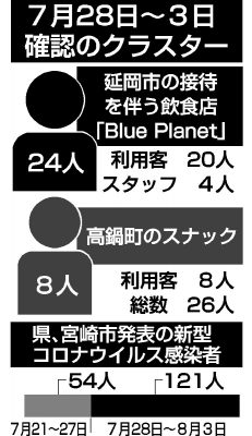 2020/08/04県内一般ニュース各地で公務員の感染も 7月28日~8月3日の1週間に県と宮崎市が発表した新型コロナウイルスの感染者数は、121人となった。前週(7月21~27日)の54人から急増。この間、延岡市の接待を伴う飲食店「Blue(ブルー) P(プ)lan...