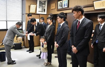 サッカー通じ地域活性化へ 都農町、JFC宮崎選手らへ「協力隊」委嘱