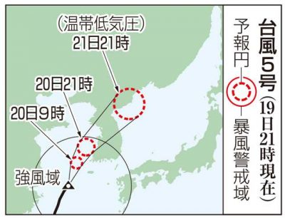 2019/07/20県内一般ニュース大型の台風5号は19日、東シナ海を北上し、県内はほぼ全域が強風域に入った。宮崎地方気象台によると、台風から暖かく湿った空気が流れ込み、延岡市北方では午後6時25分までの1時間雨量が7月の観測史上最高となる68・5ミリとなるなど大雨となった...