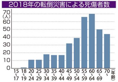 2019/05/25県内一般ニュース県内で2018年に起きた労働災害死傷者の年代別で、60代が25%(336人)と最多となり、これまでトップだった50代を初めて上回ったことが、宮崎労働局のまとめで分かった。原因別では段差でつまずくなどの「転倒」が最も多く、60歳以上の労働者...