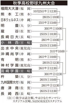 2025/10/18学生スポーツ宮崎市で25日に開幕する高校野球の秋季九州大会(第157回九州大会)の組み合わせ抽選は17日、宮崎市のひなた武道館で行われ、出場16校の1回戦カードが決まった。県予選を制した小林西は25日のSOKKENスタジアム第2試合(午後1時)で出水...