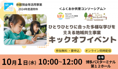 2025/09/30サンプル一般財団法人ちくご川コミュニティ財団10/1 博多区でキックオフイベント開催 休眠預金を活用した新規事業 まだ支援につながっていない不登校の子どもと家庭を支援する 3年間の事業 一般財団法人ちくご川コミュニティ財団(所在地:福岡県久留米...
