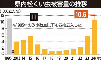 2025/09/27社会news林野庁は、県内で2024年度に確認された「松くい虫被害」で枯れたマツの量が1万600立方メートルだったと、27日までに発表した。被害量は22年度から5倍近くに急増しており、1995年度以来30年ぶりの被害規模となった。宮崎市内では県内の約...