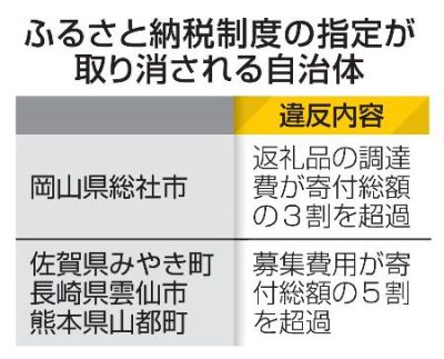 2025/09/26国内外ニュース 主要総務省は26日、ふるさと納税のルールに違反したとして、岡山県総社市、佐賀県みやき町、長崎県雲仙市、熊本県山都町を制度の対象から除外すると発表した。寄付の募集費用や返礼品の調達費が基準を上回った。除外期間である9月30日から2年間は、4市町...