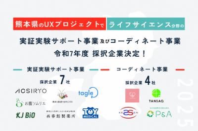 2025/09/25サンプル熊本県ライフサイエンス分野で地域課題解決と新産業創出を目指す採択企業を発表 熊本県(知事:木村 敬)が推進する「UXプロジェクト」では、世界中の人々が自分らしく最期まで「健康で」「楽しく」「美しく」いられる生活を実現することを目指し、ライ...