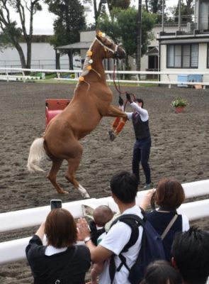 2025/09/24県内一般ニュース馬を身近に感じてもらうイベント「第34回馬に親しむ日」は23日、宮崎市花ケ島町のJRA宮崎育成牧場であった。雨で一部のイベントは中止したが、多くの家族連れでにぎわった。 馬が調教師の指示に合わせて演技するホースショーには、東京競馬...