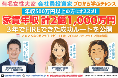 2025/09/23サンプル株式会社セイコー・エステート&ディベロップメント家賃年収1.6億円のシングルマザー子育て大家と、自己資金200万円から7億円融資を獲得し15棟を運用する「ミスターK」が登壇。不動産投資初心者でも再現できる“資産形成の順番”を学べる。 9/...