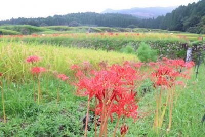 2025/09/19トピックnews20日の秋の彼岸の入りを前に、「日本の棚田百選」に選ばれている日南市酒谷の坂元棚田では、ヒガンバナが見頃を迎えている。あぜ道を彩るかれんな赤い花と黄金色に実った稲穂の“共演”が、観光客らの目を楽しませている。 ヒガンバナは、地域住...