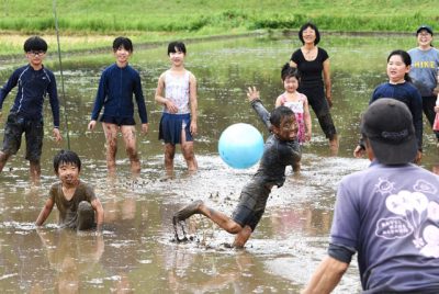 大人も子どもも顔まで真っ黒 田んぼでドッジボール 綾町